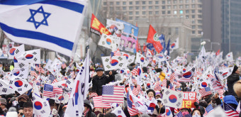 #극우 교인들의 서울시청앞 집회 장면. 태극기와 성조기, 이스라엘기가 동원되는 게 특징이다.