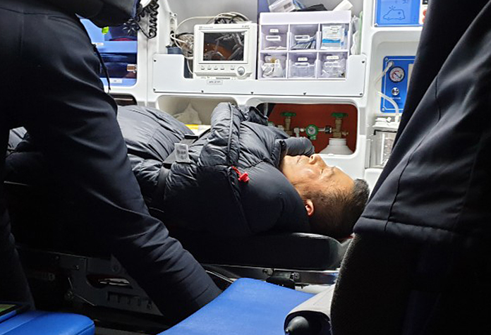 #황교안 자유한국당 대표가 27일 단식 농성 중 의식을 잃고 쓰러져 신촌 세브란스병원으로 이송되고 있다. Ⓒ자유한국당 홈페이지
