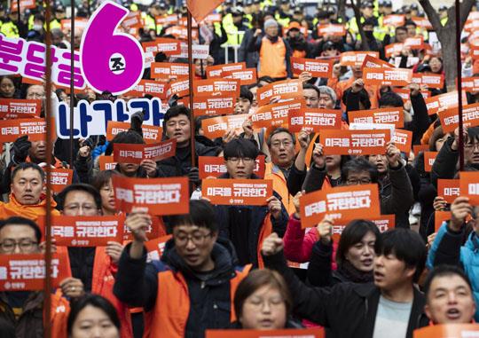 방위비분담금 인상 강요 미국 규탄 결의대회│11월 30일 서울 중구 미국대사관저 인근에서 열린 한미동맹 파기, 방위비 분담금 강요 미국 규탄 민중당 결의대회 민중당원들이 구호를 외치고 있다. 연합뉴스 윤동진 기자