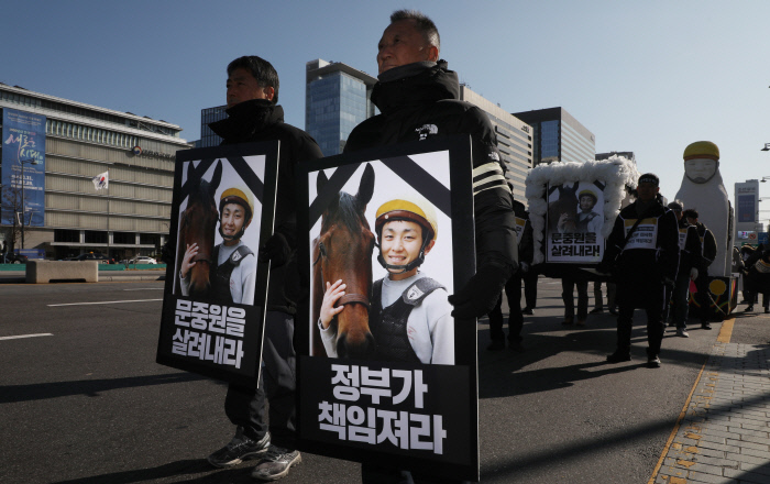 문씨가 숨진 뒤 민주노총 공공운수노조는 전국 기수 125명 가운데 75명을 대상으로 설문조사를 했다. 응답자의 58.5%가 ‘조교사로부터 부당한 지시를 받은 경험이 있다’고 답했다. 고작 125명이 뛰는 직종에서 벌어지는 갑질이라고 외면할 수 없는 것은 그것이 갑질이 만연한 한국 사회의 축도로 여겨지기 때문이다.