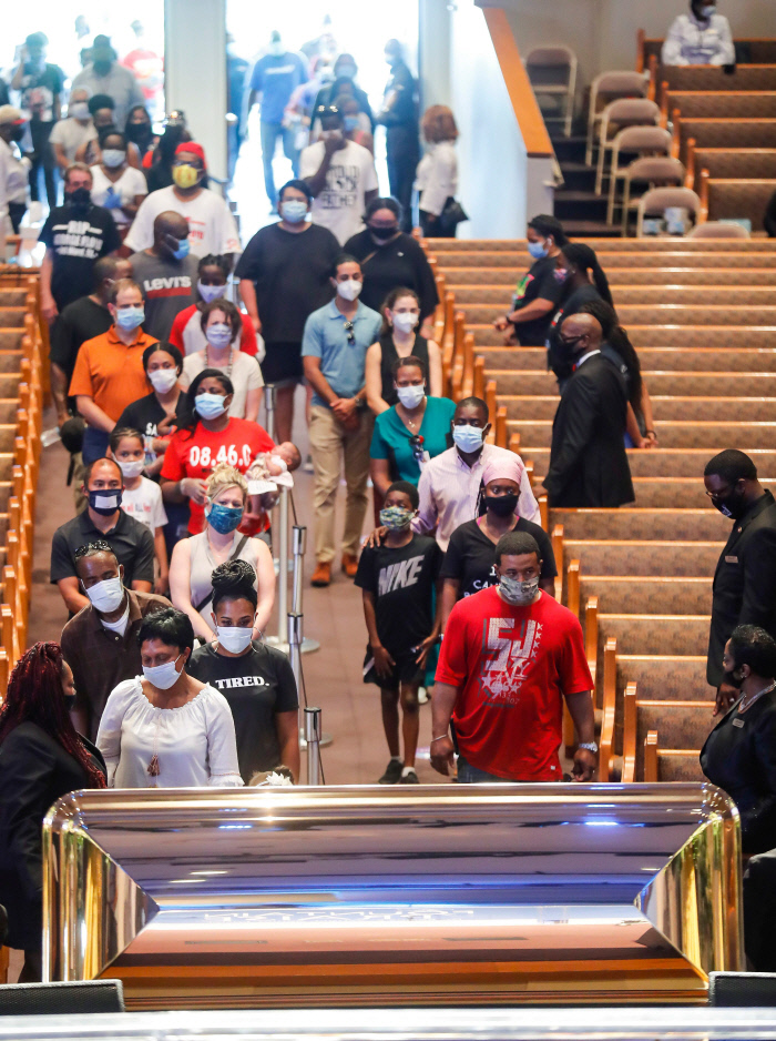 #미국 백인 경찰 데릭 쇼빈의 가혹 행위로 숨진 흑인 조지 플로이드의 추도식이 8일(현지시간) 텍사스 주 휴스턴의 파운틴 오브 프레이즈 교회에서 열리자 그의 관 앞에 조문객들이 줄지어 차례를 기다리고 있다. 플로이드의 동생인 필로니즈 플로이드는 백인 경찰 폭력에 희생된 흑인들의 이름을 언급하며 “우리는 정의를 실현할 것”이라고 울먹였다. 휴스턴|AFP연합뉴스