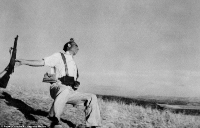 사진전에는 그 유명한 ‘ 로버트 카파’도 걸려 있었다. 카파가 1936년 첫 종군한 스페인 내전 때 코르도바 전선에서 찍은 것으로, 한 공화파 병사가 어디선가 날아온 총탄을 맞고 쓰러지는 순간을 절묘하게 포착했다. 그는 무엇을 위해 공화파 진영에서 싸우다 이런 최후를 맞게 됐을까.