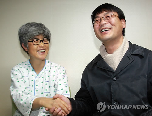 #희망버스 기획자로 알려진 송경동 시인이 지난 2011년 11월 15일 오후 309일간의 크레인 농성을 끝내고 내려온 김진숙 민주노총 부산본부 지도위원을 만나 악수하고 있다.