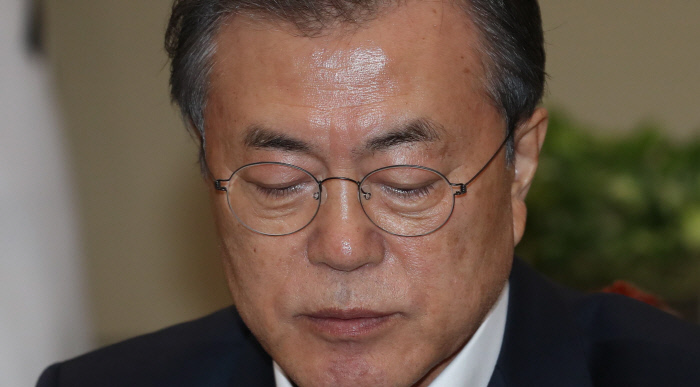 #문재인 대통령이 2019년 10월 14일 청와대에서 열린 수석·보좌관 회의에서 생각에 잠겨 있다. 청와대사진기자단