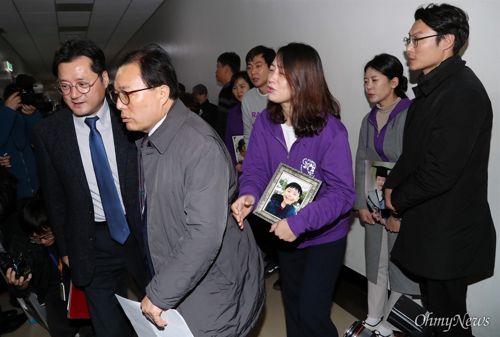 태호, 해인이, 민식 군 부모들이 지난해 11월 27일 오전 국회 행정안전위원회 전체회의장 앞에서 자유한국당 이채익 의원을 붙잡고 어린이생명안전법의 신속한 처리를 호소하고 있다. 영정사진을 든 사람이 태호 엄마 이소현씨다. /오마이뉴스 남소현 기자
