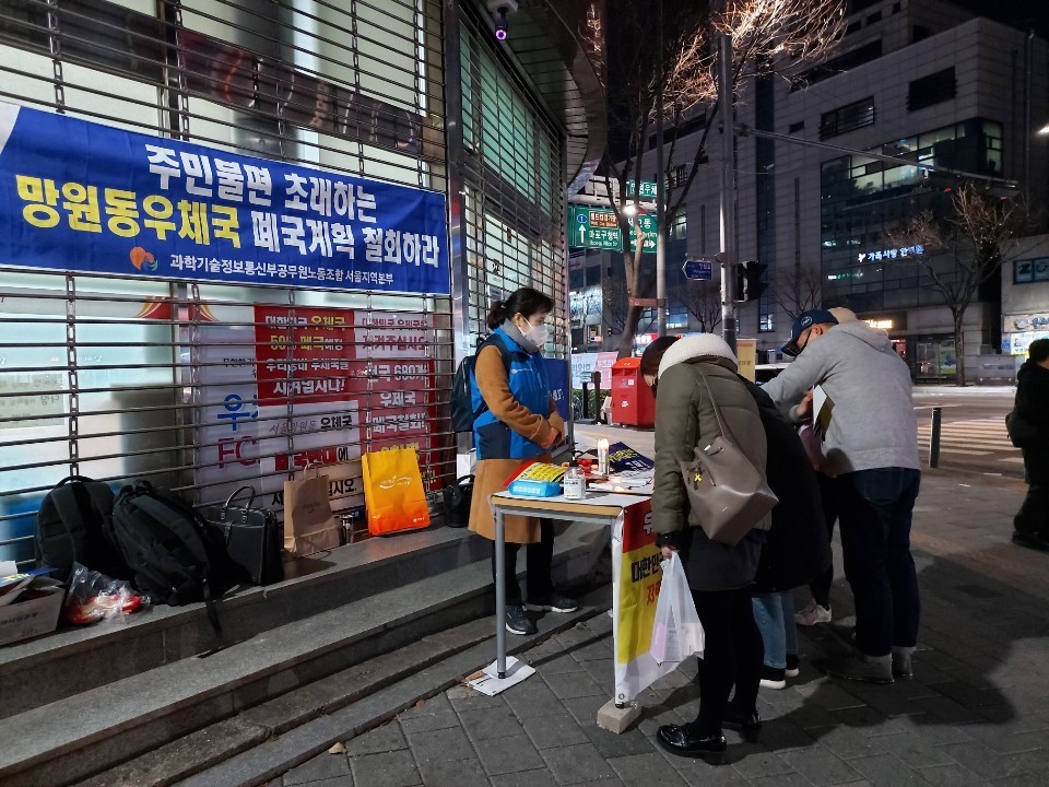 지난 2일 저녁 서울 마포구 망원동우체국 앞에서 주민들이 우체국 폐국 반대 서명운동에 참여하고 있다. /한겨레신문