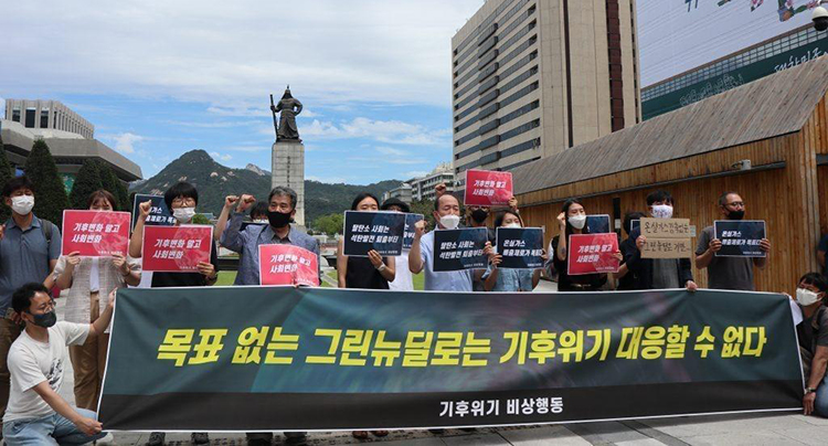 기후변화 대응은 선의만 갖고 되는 게 아니다. 단호한 결의와 정교한 프로그램이 받쳐줘야 한다. 기후위기비상행동 회원들은 지난 15일 서울 광화문광장에서 기자회견을 하며 이런 플래카드를 내걸었다. “목표 없는 그린 뉴딜로는 기후위기 대응할 수 없다.” 2020.07.24 12:44